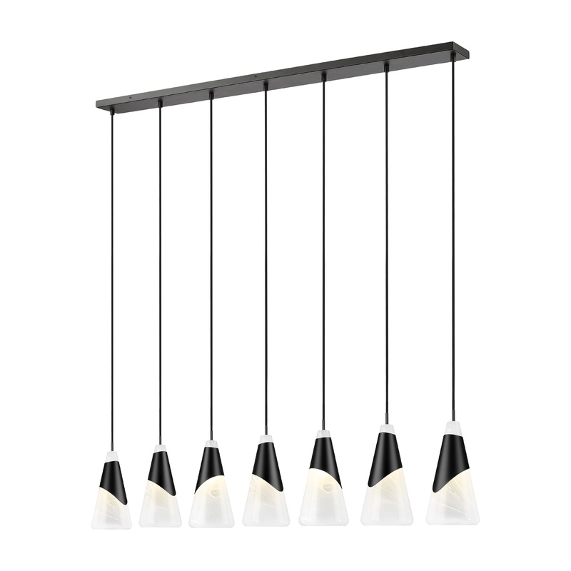 Capturing the natural beauty of melting ice, the Aimie collection boasts frosted artisanal glass in an abstract swirl pattern. A metal shroud encircles the glass shade, reducing glare while providing softly diffused light. Available in Matte Black, Brushed