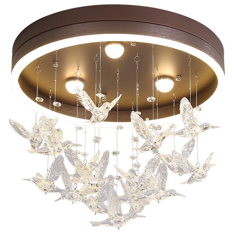 Crafted with meticulous attention to detail, the chandelier features a modern frame adorned with delicate golden bird figurines. The high-quality metal construction ensures durability and a luxurious appearance, while the golden birds add a whimsical and charming element to the design.