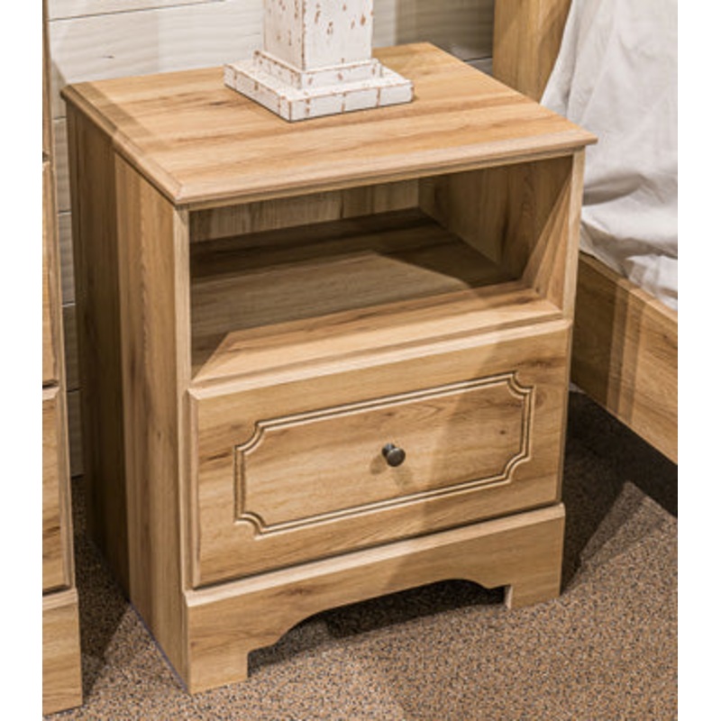 Country rustic. Vintage inspired. However you see it, youre sure to be charmed by this nightstand. Adorned with a chic drawer knob and a warm oak grain finish, it offers a relaxed mix of picturesque aesthetics. Its storage space gracefully welcomes bedside necessities. And built-in USB charging adds a dose of modern convenience, keeping your devices powered up from dusk to dawn. With an air of easygoing elegance, this piece lets you drift away to a simpler time and place.