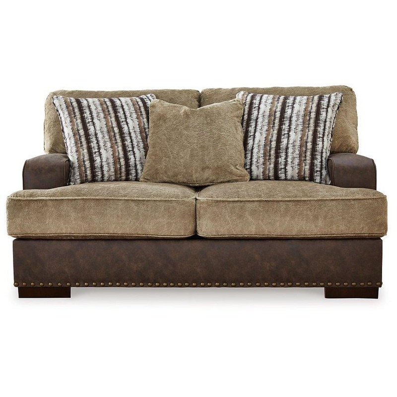 Punctuated by a subtle band of nailhead trim, this loveseat is perfect for those who love the look of leather. Two textural tones provide twice the style and comfortand incorporate an added layer of visual interest. Throw pillows add a fun decorative element.