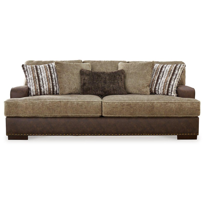 Punctuated by a subtle band of nailhead trim, this sofa is perfect for those who love the look of leather. Two textural tones provide twice the style and comfortand incorporate an added layer of visual interest. Throw pillows add a fun decorative element.