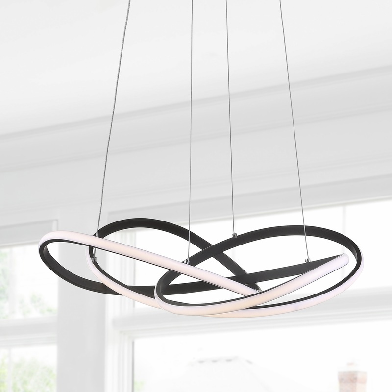 Intertwined curves of LED lights emitting from black iron create a look that is soft and elegant from materials traditionally known for their industrial strength. At 25″ in diameter, it is stunning over a wood dining table, or incorporated as a way to soften industrial decor. With 36 watts of integrated LED lights, it is bright enough for a kitchen, but elegant enough for a living room, making it a versatile selection for anywhere in the home.