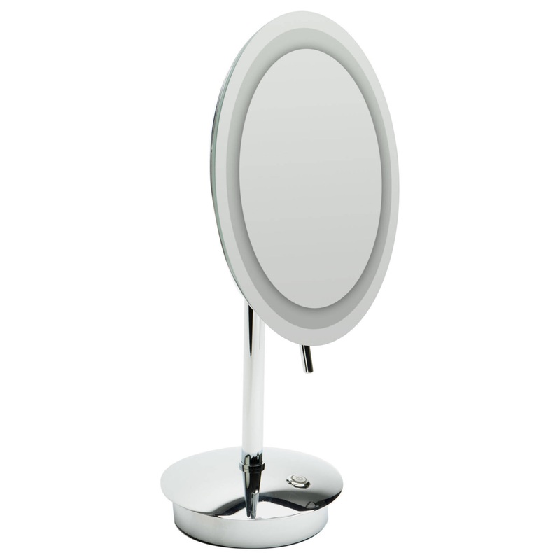 -Pure White bright LED lighting -Mirror is frameless -Unique design offers the convenience of battery or plug in usage, so you can use the mirror anywhere! -Innovative light touch button for ease of use -Mirror magnifies up to 5x! -Freestanding tabletop mi