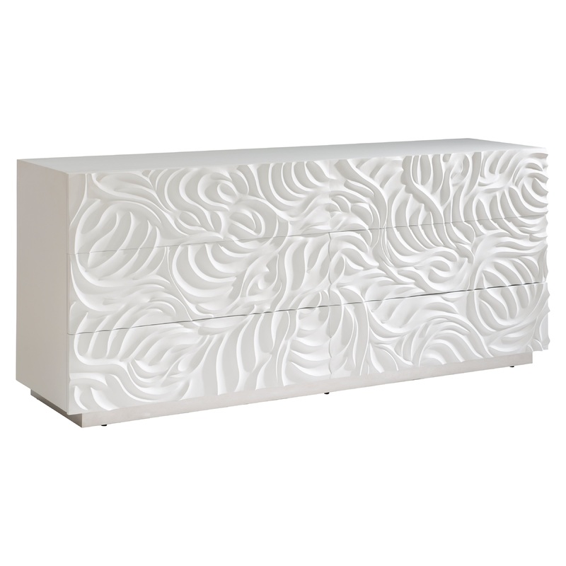 Textural drama and movement make a stunning statement on the Alia dresser. The modern organic look is achieved with gorgeous swirls on the carved cast drawer fronts, completed with our White Plaster finish. The deep carvings resemble the interior of a rare shell or the intricate whorls of a peonys bloom. The inspired design rests on a plinth base of polished stainless steel.