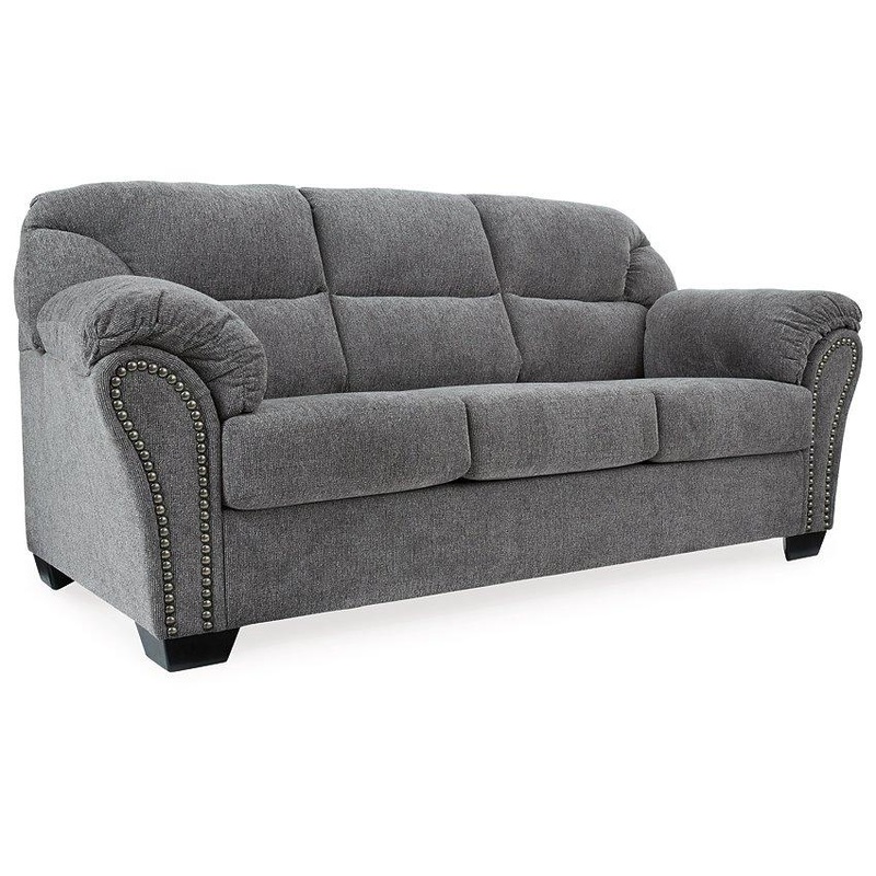 Why sacrifice comfort for style (or style for comfort) when you can have the best of both in this sofa in pewter gray. Elements include a chic divided-back design and pillow top wrapped armrests that make nodding off all too easy. Calling attention to the elegantly flared armrestsblack nickel-tone nailhead trim for a punch of cool character.