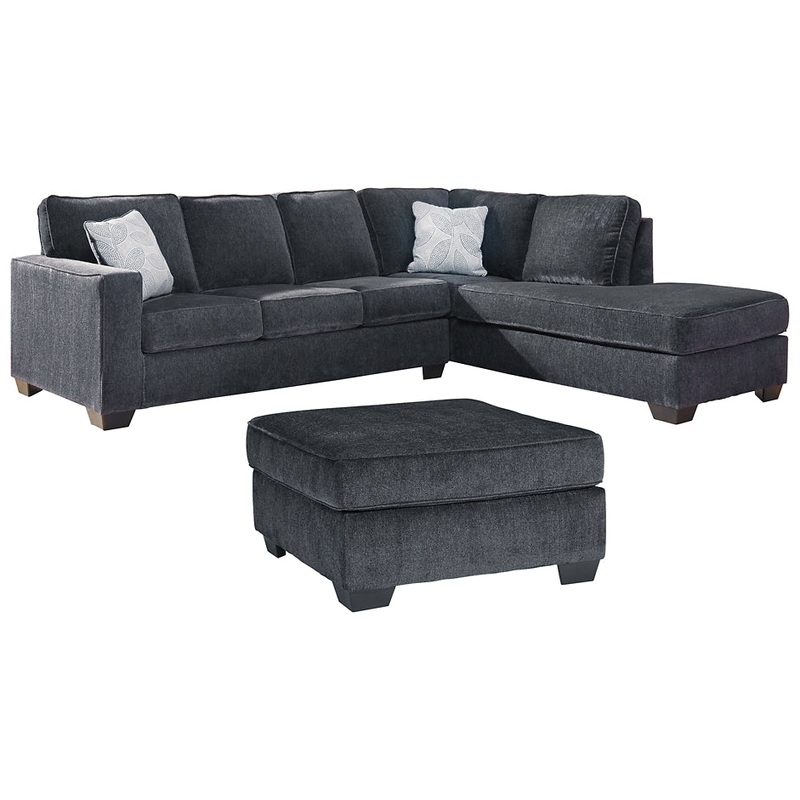 If style is the question, then this 2-piece sectional with ottoman is the answer. Sporting clean lines and sleek track arms, the decidedly contemporary profile is enhanced with plump cushioning and a chenille-feel upholstery that’s so pleasing to the touch. Sure to play well with so many color schemes, this living room set in slate gray includes understated floral pattern pillows for fashionably fresh appeal.