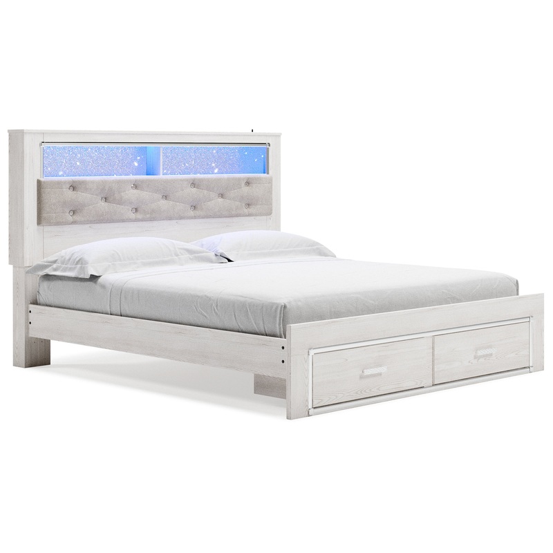 The epitome of fashion-forward design, this king upholstered bookcase bed is a beautiful blend of comfort and luxury. Shiny chrome-tone accents, a pearlized finish and button-tufted upholstery bring a glam touch to the richly rustic appearance. Remote-controlled LED lighting adds style and modern convenience to your restful retreat.