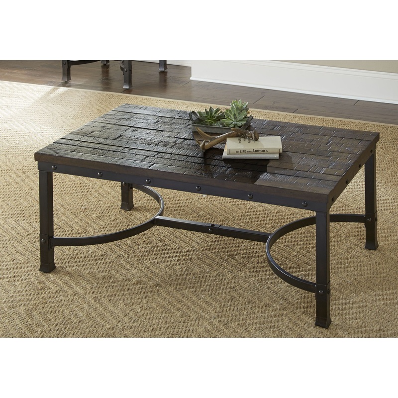 The Ambrose collection features a butcher block style wood surface that gives an aged and antiqued look. The rustic styling is accentuated by the dark iron legs and Demilune stretchers that connect in the middle. The distressed finish of the Ambrose cocktail table will easily blend with existing dcor. Available for purchase separately is the matching end table. Your purchase includes one cocktail table.