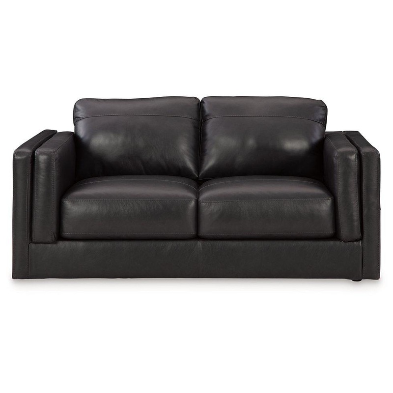 Keen on crisp, contemporary design? Adore the pleasure of leather? Look no further. This loveseat satisfies on every level. Richly textured and decadently supple, the cushion is wrapped with combination leather and faux leather upholstery in an on-trend onyx tone. Sleek double-padded arms and a low, clean-lined profile complete the spacious loveseat’s simply chic appeal.