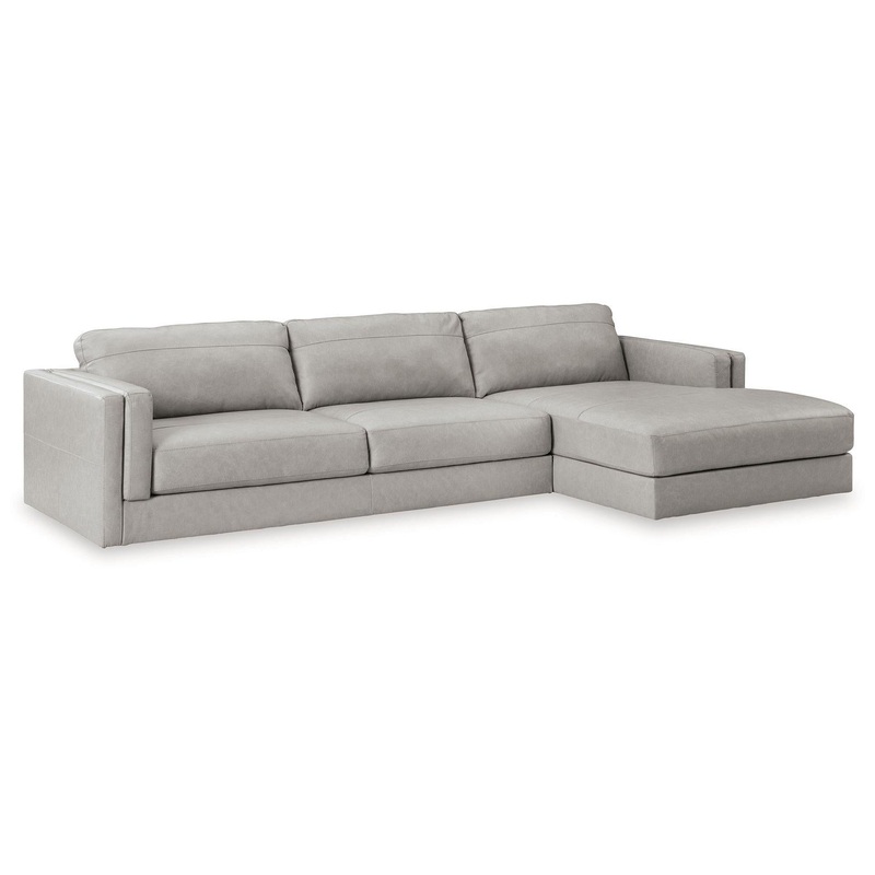 Keen on crisp, contemporary design? Adore the pleasure of leather? Look no further. This sectional with chaise satisfies on every level. Richly textured and decadently supple, the plush cushions are wrapped with leather match upholstery in an on-trend neutral tone. Sleek double-padded arms and a low, clean-lined profile complete this spacious sectional’s simply chic appeal.