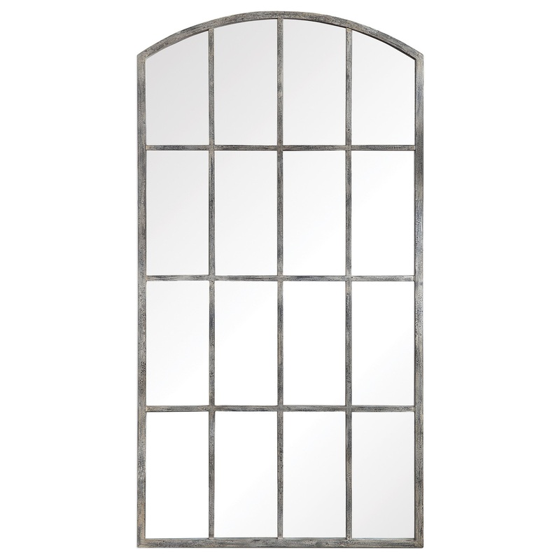 Contemporary and French Country styles merge in this arched mirror. Reminiscent of a large window, this piece features a hand forged iron construction with an aged rust gray finish that has been distressed and covered in an off-white wash.