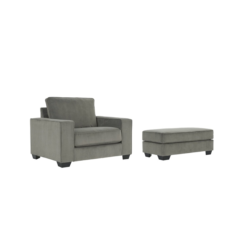 Serving up a refined, upscale lookat an incomparable value pricethis chair and ottoman package lures from every angle. Crisp box cushioning, wide track arms and black tapered feet lend a clean, contemporary aesthetic. Velvety soft upholstery in a chic sandstone gray takes neutral to another level.