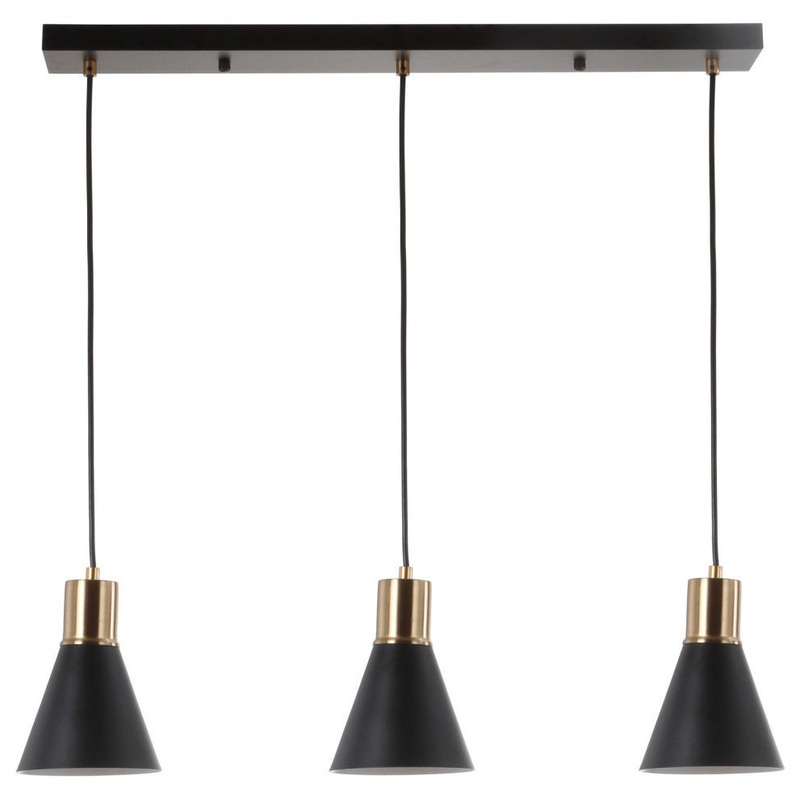 Cone shades with brass flutes hang in perfect harmony in this trio of pendants hanging from a single base. Adjustable in height, you can customize the drop to hang at the appropriate height whether over a kitchen island or in a formal dining room. We love seeing this fixture stand out in a while room, or create a sculptural effect as it hangs from a ceiling painted black.