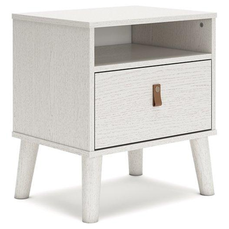 Dare to take minimalism to the max. This nightstand has an air of sleek simplicity thanks to its white painted finish with subtle replicated wood grain. Magnificently mod splay legs are a compelling complement to the streamlined design. And with two different faux leather drawer pulls that allow you to customize the nightstand to suit your space, there’s no doubt about it: This contemporary piece is sure to become a classic.