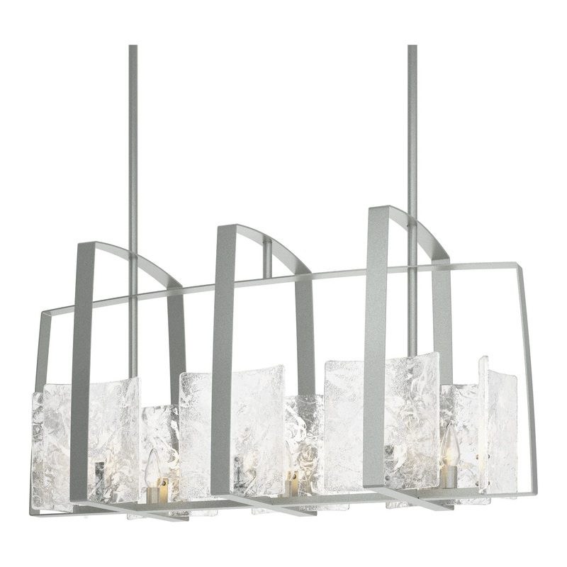 Sweeping arcs of steel and classic lines envelope eight elegant pieces of clear glass with flowing white swirls. The Arc Linear Pendant features eight Candelabra sockets and is suited to a variety of settings. Available in all standard finishes.