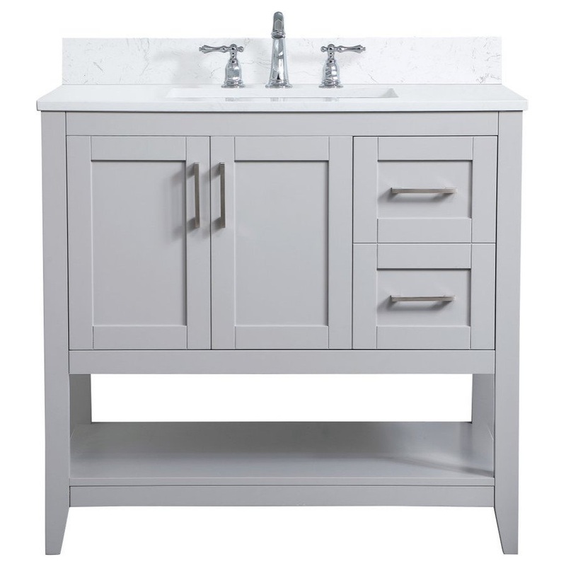 The nonchalant attitude of this 36″ traditional grey finish vanity will have you wanting more. The slender brushed nickel handle bars open the 3 cabinet doors to reveal ample storage space to put away and store bathroom essentials, and the open space below allows for you to place clean towels on the rack. Topped with a Engineered Marble countertop, you and your guests will enjoy this easy going vanity. Comes with a matching backsplash to complete the look and protects your wall. (FAUCET NOT INCLUDED)