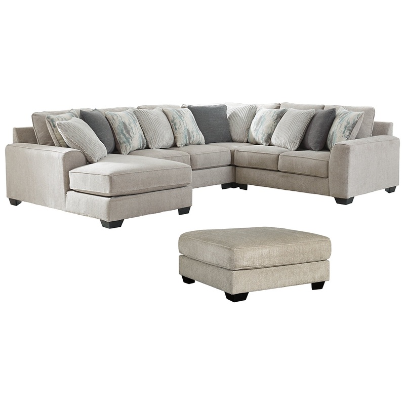 This 4-piece sectional with ottoman delights with deep comfort. Its casually styled with big, roomy seats and textured chenille upholstery. Youll find comfort in the plush, reversible cushions. Guests are sure to fight over who will get to relax on the cor