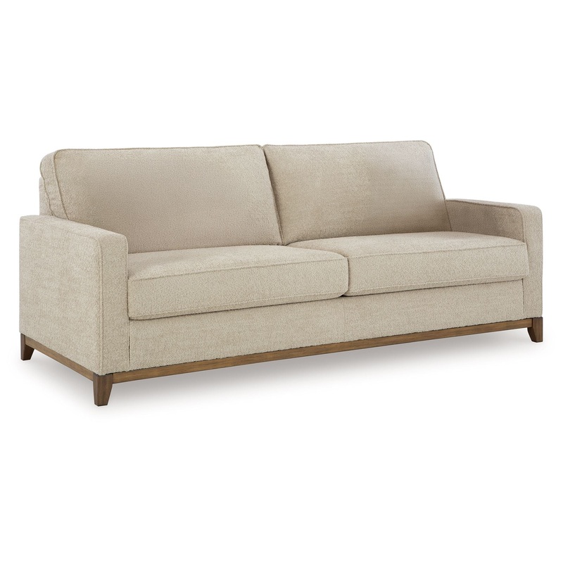 Serene style with a modern sensibility. Delight in the cozy, versatile embrace of this sofa. It takes an on-trend approach to irresistible texture and natural beauty, showcasing soft upholstery accented with a transitional wood trim. As refined as it is laid back, the sofa also keeps comfort a priority with plush, thick seat cushions.