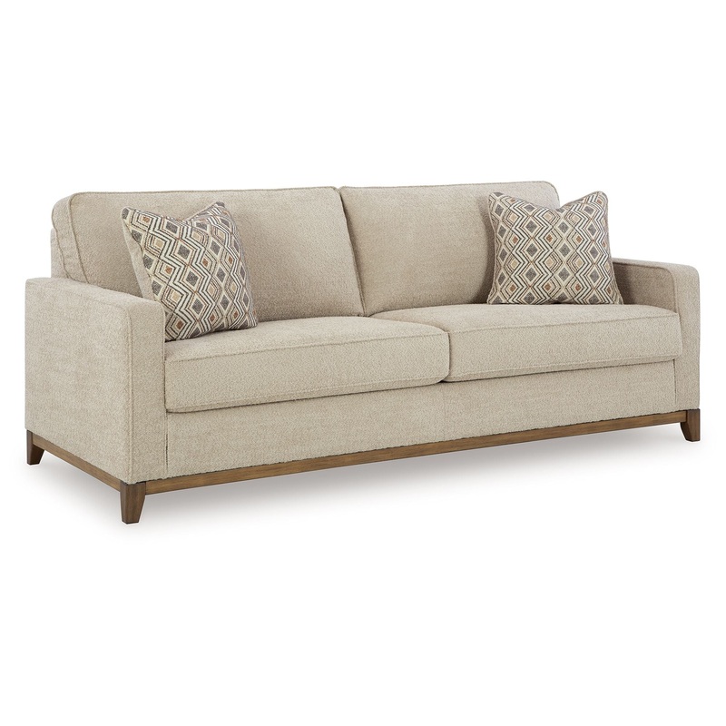 Serene style with a modern sensibility. Delight in the cozy, versatile embrace of this sofa. It takes an on-trend approach to irresistible texture and natural beauty, showcasing soft upholstery accented with a transitional wood trim. As refined as it is laid back, the sofa also keeps comfort a priority with plush, thick seat cushions.
