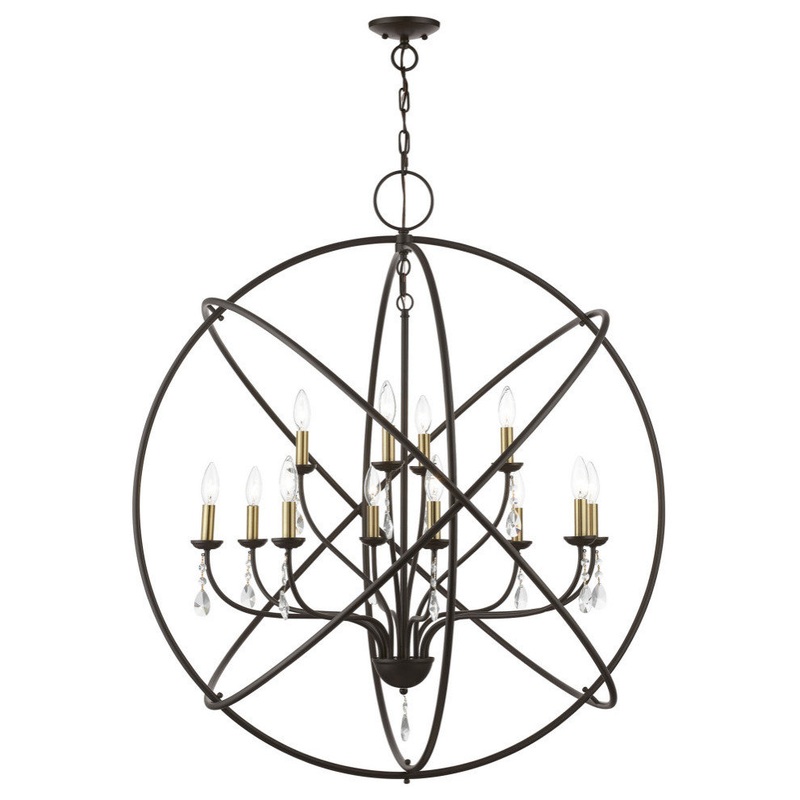 The delicate dangling crystals of the Aria collection adds an eclectic counterpoint to the grande luxurious orb. The twelve-arm light cluster nestled within orbiting rings features faceted clear teardrop crystals. This fixture will look fabulous in the foyer or entryway. With its easy installation and low upkeep requirements, this light will not disappoint. It is shown in a bronze finish with antique brass finish candles.
