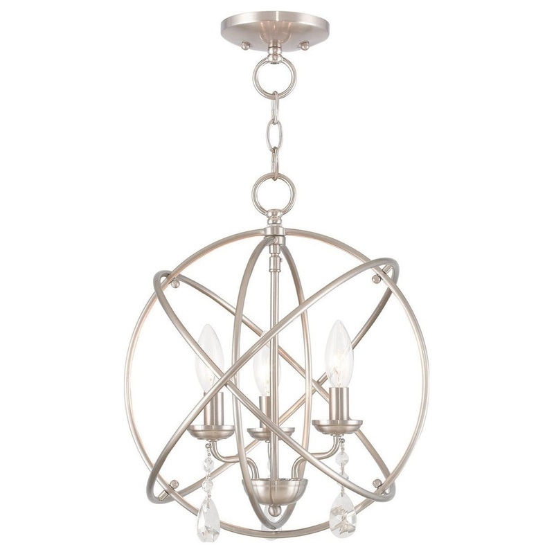 Delicate dangling crystals add a luxurious counterpoint to this brushed nickel orb. The three arm cluster nestled within orbiting rings features teardrop crystals. Use a couple of these fixtures over your kitchen island or convert this to a ceiling mount m