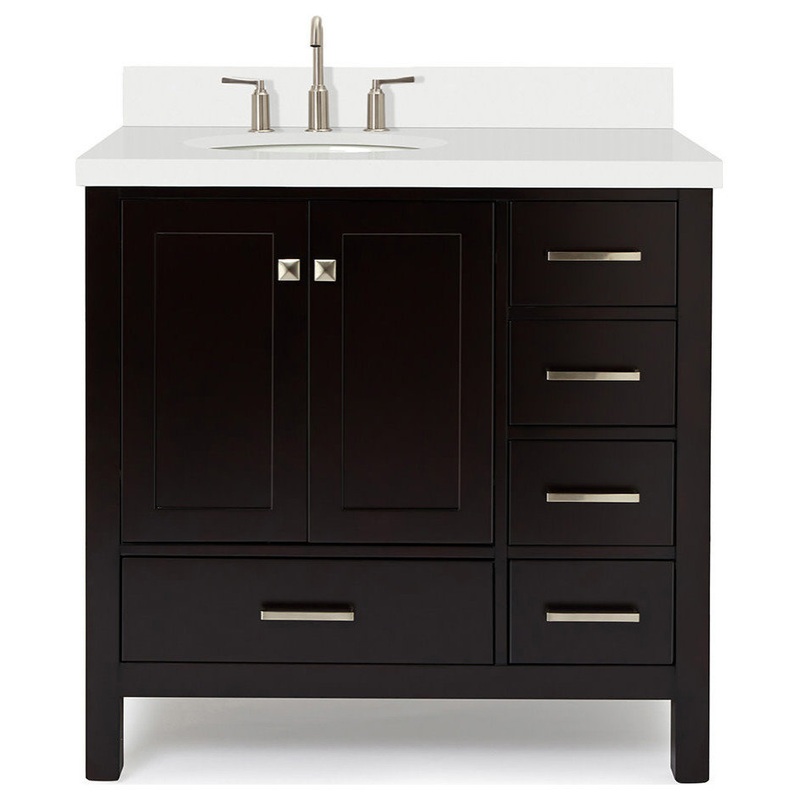The Cambridge series from Ariel Bath is the perfect choice for those looking for a modern bathroom vanity. The Cambridge is available in single or double sink models with under-mount sinks included. Available with multiple options from countertop type to hardware color and cabinet finish, you can be sure youll find your perfect match with the ARIEL Cambridge vanity collection. Included Components: Covered under Ariel’s 3 year limited warranty Hardwood vanity cabinet with 2 doors and 5 drawers Quartz vanity top with 1 basin sink and matching backsplash Faucet is not included and must be purchased separately Cabinet Features: Constructed from hardwood providing a lifetime of durability Free standing installation vanity is seated on the floor with wall anchors, providing a functional design Double door design provides easy access to storage space 5 full extension drawers with soft-close slides allows for organized storage Soft close drawer slides operate on smooth ball-bearings and prevent drawers from slamming shut Vanity cabinet includes matching decorative hardware Vanity will need to be assembled Vanity Top Features: Quartz vanity top includes 1 undermount sink 3 pre-drilled faucet holes Each sink features its own oval single basin work space Left drain location increases available space under the sink Equipped with an overflow drain to help prevent water overflow and spillage from occurring Vanity top includes matching backsplash Cabinet Specifications: Cabinet Width: 36″ (from left to right) Cabinet Height: 34-1/2″ (from top to bottom) Cabinet Depth: 21-1/2″ (from front to back) Number of Doors: 2 Number of Drawers: 5 Vanity Top Specifications: Vanity Top Width: 37″ (left edge to right edge) Vanity Top Depth: 22″ (front edge to back edge) Backsplash Height: 4″ Number of Basins: 1 Sink Measurements: 19-5/8″ L x 16″ W x 8-1/4″ H Sink Basin Measurements: 17-3/4″ L x 14-1/8″ W x 7″ H Number of Faucet Holes: 3 Faucet Centers: 8″ (distance between the installation holes for the faucet handles)