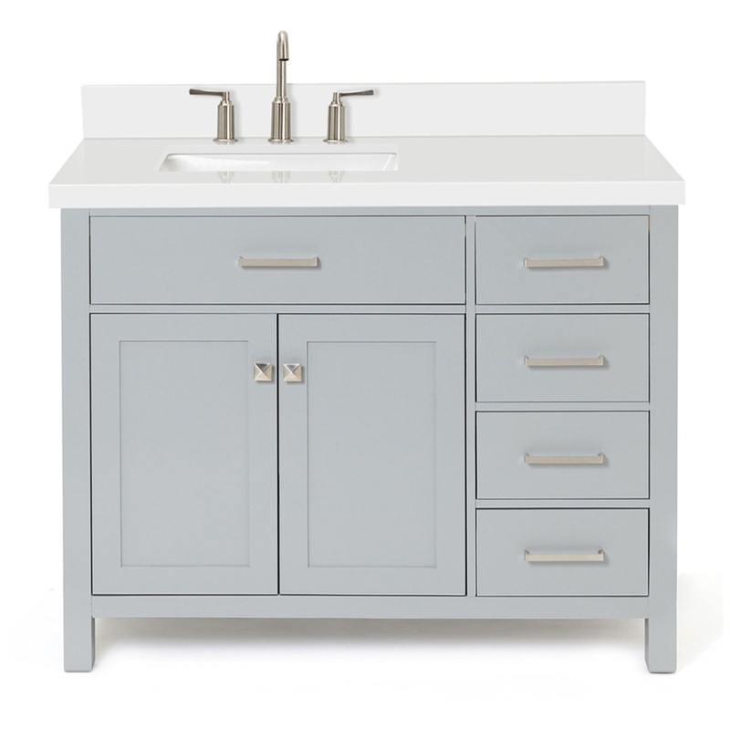 Elegance and simplicity keynote the versatile Bristol collection. Clean lines and square shapes are accented by the modern handles that make the Bristol collection a perfect choice for your bathroom decor. Included Components: Covered under Ariel’s 3 year limited warranty Solid wood and engineered wood vanity cabinet with 2 doors and 4 drawers Quartz vanity top with a single sink and backsplash Faucet is not included and must be purchased separately Cabinet Features: Constructed from solid wood and engineered wood providing a lifetime of durability Free standing installation – vanity is seated on the floor with wall anchors, providing a functional design Double door design provides easy access to storage space 4 full extension drawers with soft-close slides allows for organized storage Soft close drawer slides operate on smooth ball-bearings and prevent drawers from slamming shut Vanity cabinet includes matching decorative hardware Vanity will need to be assembled Vanity Top Features: Quartz vanity top includes an undermount sink 3 pre-drilled faucet holes Each sink features its own rectangular single basin workspace Center drain location provides optimal draining capability Sink does not include an overflow Vanity top includes matching backsplash Cabinet Specifications: Cabinet Width: 42″ (left to right) Cabinet Height: 34-1/2″ (top to bottom) Cabinet Depth: 21-1/2″ (front to back) Number of Doors: 2 Number of Drawers: 4 Vanity Top Specifications: Vanity Top Width: 43″ (left edge to right edge) Vanity Top Depth: 22″ (front edge to back edge) Backsplash Height: 4″ Number of Basins: 1 Sink Dimensions: 7-1/2″H x 15-1/8″W x 20-1/4″L Sink Cutout Length: 17-1/4″ (left to right) Sink Cutout Width: 12″ (front to back) Sink Basin Dimensions: 18-1/4″L x 13″W x 6-1/2″D Number of Faucet Holes: 3 Faucet Centers: 8″ (distance between the installation holes for the faucet handles)