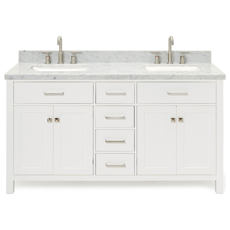 Elegance and simplicity keynote the versatile Bristol collection. Clean lines and square shapes are accented by the modern handles that make the Bristol collection a perfect choice for your bathroom decor. Included Components: Covered under Ariel’s 3 year limited warranty Solid wood and engineered wood vanity cabinet with 4 doors and 4 drawers Carrara Marble vanity top with two sinks and backsplash Faucet is not included and must be purchased separately Cabinet Features: Constructed from solid wood and engineered wood providing a lifetime of durability Free standing installation – vanity is seated on the floor with wall anchors, providing a functional design 4 door design provides easy access to storage space 4 full extension drawers with soft-close slides allows for organized storage Soft close drawer slides operate on smooth ball-bearings and prevent drawers from slamming shut Vanity cabinet includes matching decorative hardware Vanity will need to be assembled Vanity Top Features: Marble vanity top includes undermount sinks 3 pre-drilled faucet holes per basin Each sink features its own rectangular single basin workspace Center drain location provides optimal draining capability Sink does not include an overflow Vanity top includes matching backsplash Cabinet Specifications: Cabinet Width: 60″ (left to right) Cabinet Height: 34-1/2″ (top to bottom) Cabinet Depth: 21-1/2″ (front to back) Number of Doors: 4 Number of Drawers: 4 Vanity Top Specifications: Vanity Top Width: 61″ (left edge to right edge) Vanity Top Depth: 22″ (front edge to back edge) Backsplash Height: 4″ Number of Basins: 2 Sink Dimensions: 7-1/2″H x 15-1/8″W x 20-1/4″L Sink Cutout Length: 17-1/4″ (left to right) Sink Cutout Width: 12″ (front to back) Sink Basin Dimensions: 18-1/4″L x 13″W x 6-1/2″D Number of Faucet Holes: 3 Faucet Centers: 8″ (distance between the installation holes for the faucet handles)