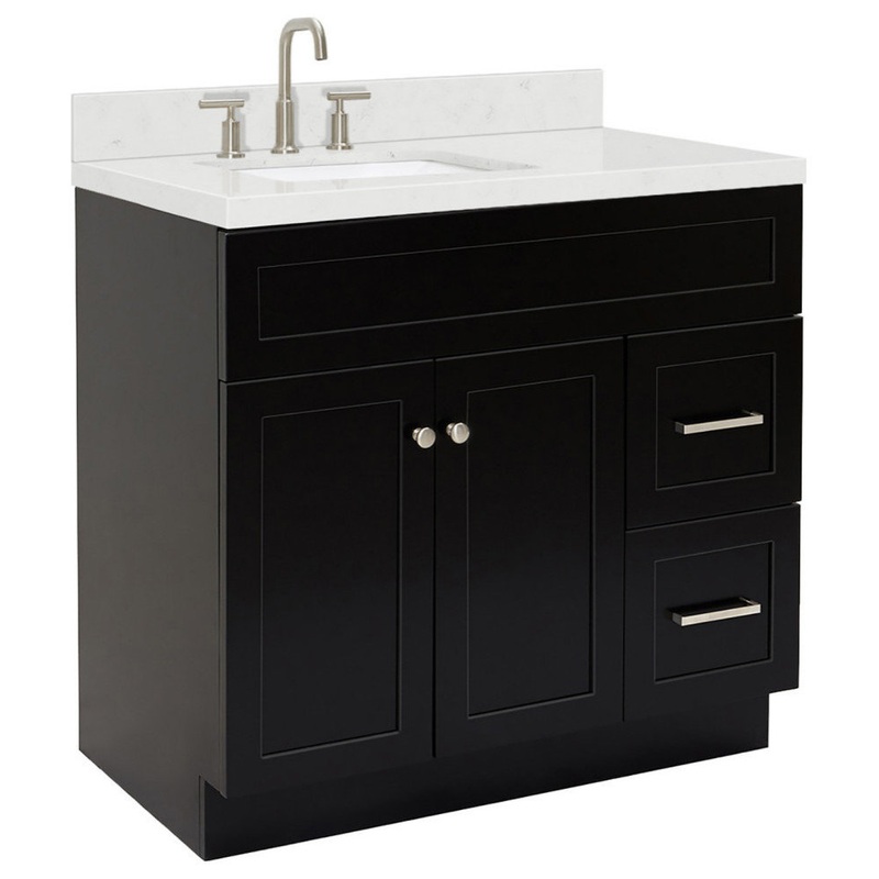 The Hamlet bathroom vanity offers granite or quartz countertops mounted above hardwood cabinets. With ample storage space, including a cabinet and dovetail drawers, these vanity sets will add an elegant aesthetic to a bathroom remodel. -Covered under Ariel