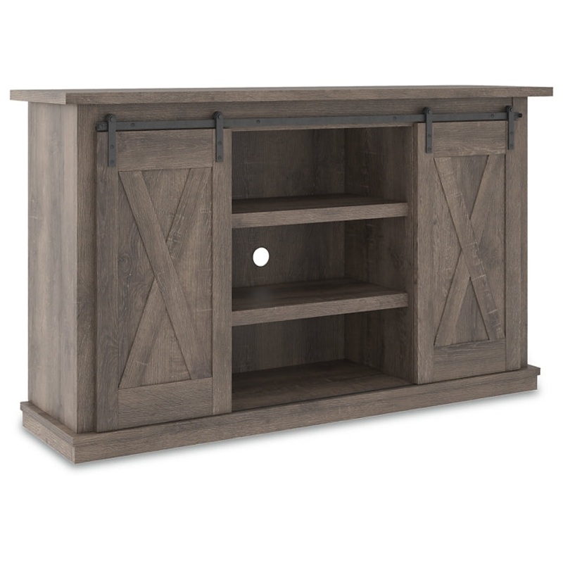With its replicated weathered oak finish, crossbuck details and authentic charm, this TV stand is right in tune with your relaxed approach to high style. Beautifully made to accommodate your media equipment, its well equipped with adjustable shelving, cutouts for wire management and, of course, a pair of sliding barn doors you can center or place to the side. What a mastery in modern farmhouse living.