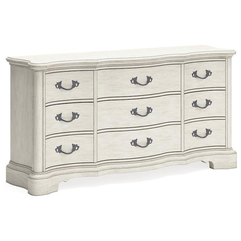 Add a touch of romance to your bedroom with this dresser. Its antiqued white painted finish and serpentine-shaped silhouette details are the picture of easy elegance. Drawers in multiple sizes offer ample storage space, while custom-designed bar pulls add originality.