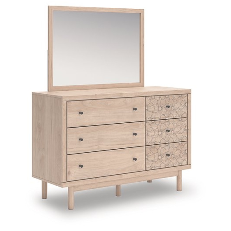 Looking for a dresser and mirror for that are both playful and practical for your little one? This set is just the ticket. The dressers charming design and light wood finish create a whimsical and inviting atmosphere. Drawers accented with a floral pattern