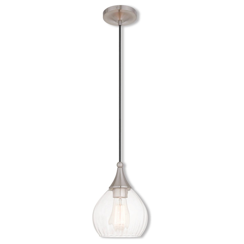 -Filament style bulbs showcased in simple shaped hand-blown clear glass add to the authentic charm of this industrial style pendant. -Glass Type/Shade Type: Clear Glass -Finish: Brushed Nickel -Material: Glass -Number of Bulbs: 1 -Bulb Base Type: Medium Ba