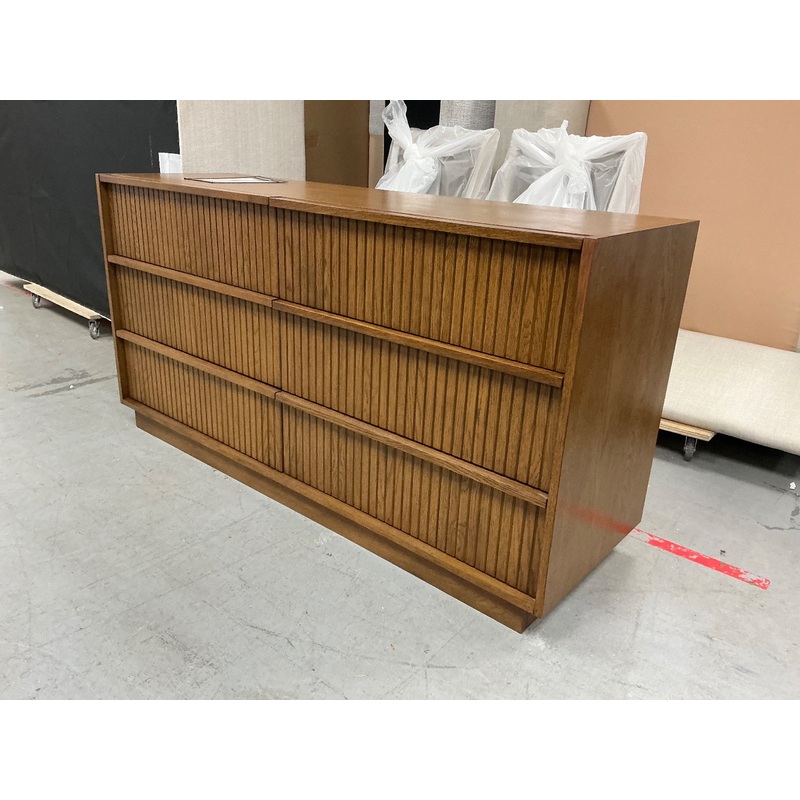 This is a dresser from the Kouva collection in smoked oak wood. Six drawers of storage. Minor discoloration on the top front right corner.