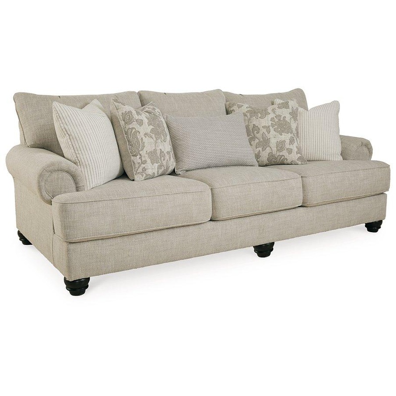 This sofa has an alluring look that’s guaranteed to turn heads. Richly textured fabric in a light, easygoing hue is enhanced by even lighter flax peeking through. Distinctive roll arms add a dab of debonair, while indulgently plush cushions cradle you softly. Sit back and relax in comfort and style, with plenty of room to stretch out and unwind at the end of a long day.