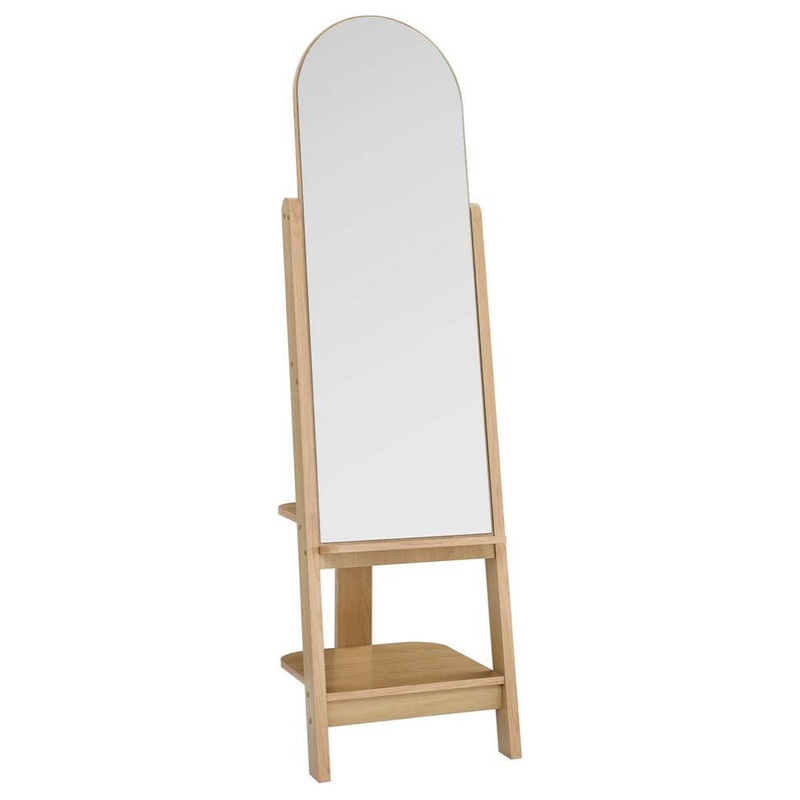 Brighten up any room with the Ascend Standing Mirror. Featuring a curved glass mirror with an arched shape, this easel mirror is crafted from a combination of mindi wood, MDF, and particleboard with a beautiful wood grain laminate. It’s versatile design boasts a shallow shelf under the mirror and two open shelves for either storage or display, while three clothing pegs offer functional hanging space. Appraise outfit selections on your way out the door with this stylish addition to a bedroom, living room, entryway, or other living space. Easy to follow assembly instructions included.