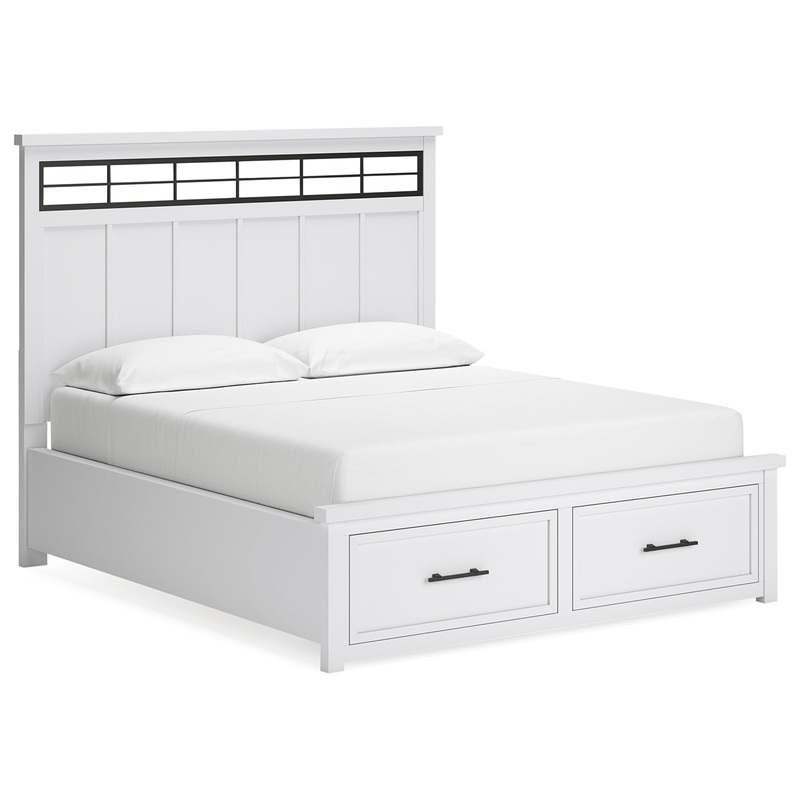 This California king panel storage bed delivers casual style with substance. An inset metal detail on the headboard displays a unique take on modern farmhouse design. The bed's sturdy silhouette, classic white finish and black pulls exude a comfortably coz