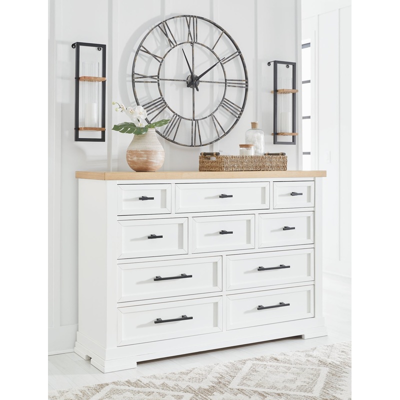 Casual style with substance. This two-tone dresser raises the bar on comfortably cozy design in your soothing sanctuary. A sturdy silhouette with a classic white finish and black metal hardware exudes modern farmhouse vibes. The butcher block oak veneer top adds a relaxed aesthetic. And this charmingly curated piece is spacious enough for all your essentials.
