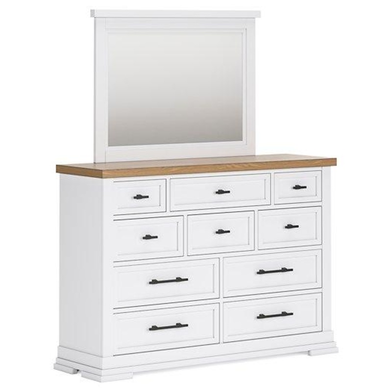 Casual style with substance. This two-tone dresser with mirror raises the bar on comfortably cozy design in your soothing sanctuary. A sturdy silhouette with a classic white finish and black metal hardware exudes modern farmhouse vibes. The butcher block o