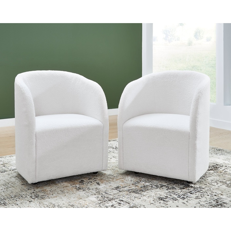 Inspired by art deco design, this fully upholstered dining chair makes a lasting impression in a simply stunning way. Its magnificent curved silhouette is enhanced with a neutral boucle upholstery thats so pleasing to the palate. This is the piece youve been looking for to elevate your contemporary decor whether youre dining, listening to your latest playlist or binge-watching with friends. Plus, its set on casters so its easy to move around.
