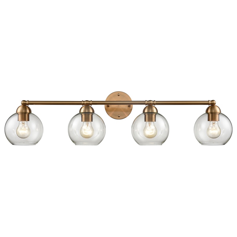 Four light bath bar in satin gold with clear round glass. Can be hung with glass facing up or downwards. Four 60 watt medium base incandescent medium base or led equivalent bulb required, not included. Hardwired only.