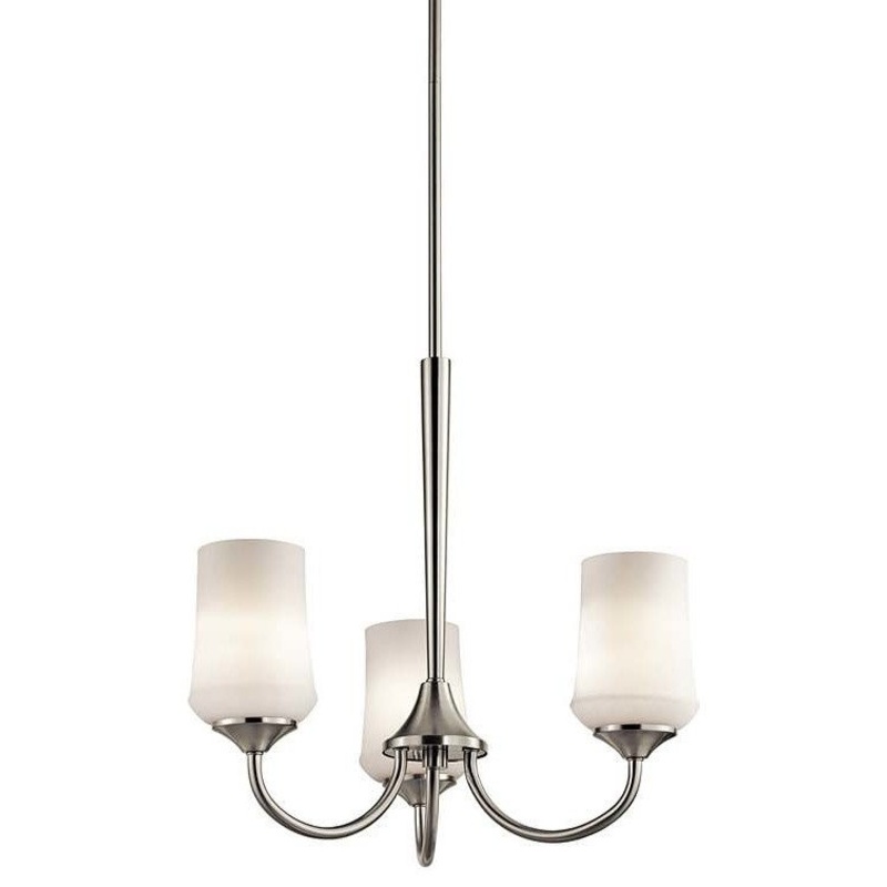 You will love the transitional styling of this Kichler Aubrey 3-light chandelier. The unique satin etched cased opal glass shades and brushed nickel tapered column design are a beautiful blend of styles, creating the perfect complement to your home. This l