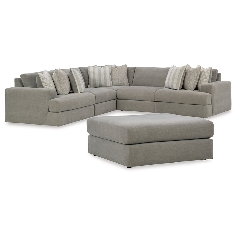 The casual, spacious shapes of this seating package make it fully lounge-ready. Deep seating invites you to sink right in, with bold beveled block arms that are softened by bullnose waterfall cushions. Best of all, the modular design lets you stage the pie