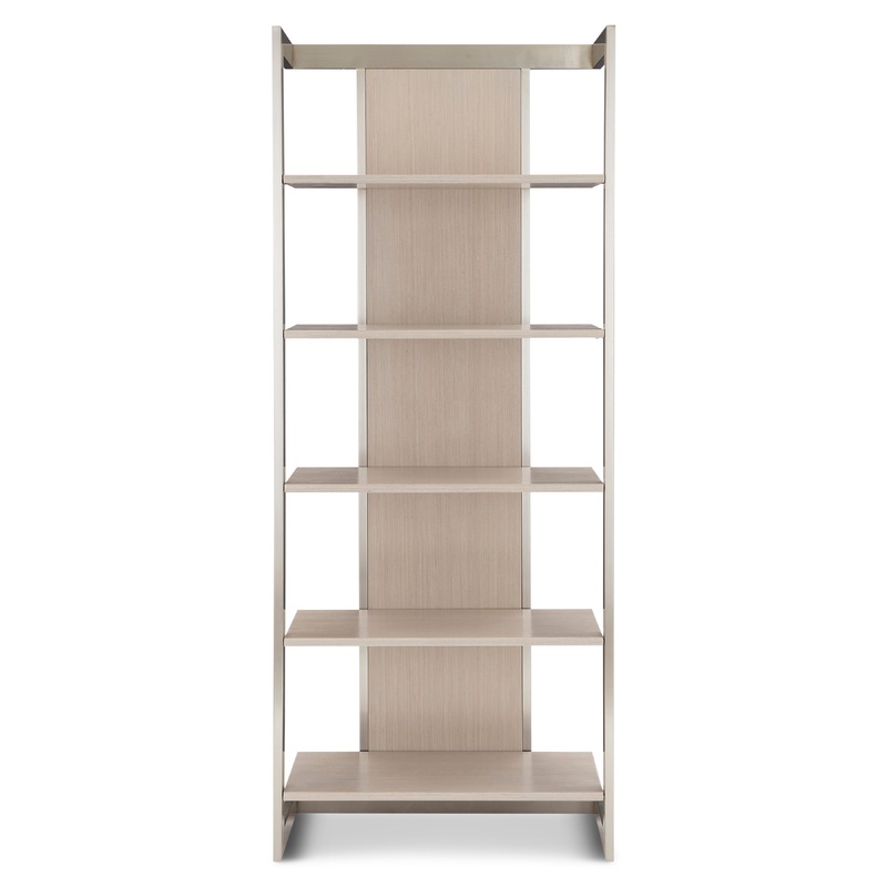 Bernhardt Workspace blends minimalist profiles and sophisticated finishes with a chic, modern feel. The Axiom etagere has a clean, airy look thanks to open shelving and an open metal framework. Five wood shelves offer plenty of space for storage and display. A center back panel showcases the linear wood grain of the veneers, while the stainless steel frame shimmers in Brushed Silver finish.