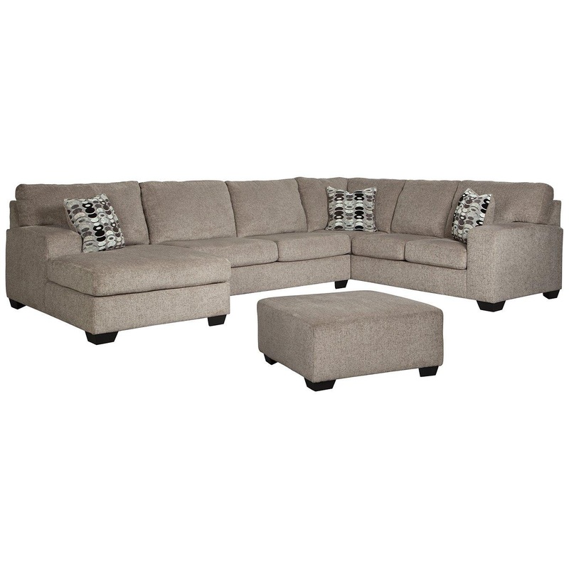 A mastery in less is more, this sectional with ottoman manages to make cool, contemporary design so warm and cozy. A new twist on neutral, the sectionals soothing platinum tone upholstery is incredibly plush to the touch. Gently rounded corners give the clean-lined profile a sense of ease, for a high-style look thats ultra inviting. Rest assured, an oversized ottoman gives everyone plenty of room to kick up their heels, or use with a tray for easy entertaining.