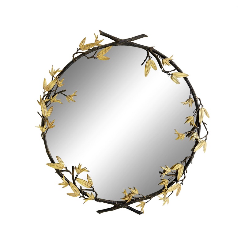 Bamboo has long been a symbol of virtue and according to Chinese folklore, it reflects people’s souls and emotions. This natural shaped bamboo motif salk mirror is formed from cast iron through the use of lost wax castings. The bamboo stalks carry a bronze finish with slight golden accents on the raised and relief areas with antique brass finish on the leaves, as the leaves would grow in nature on the bamboo stalks. The leaves seems to “travel” around the frame, starting from one side and point and ending on the other side and point of the mirror. Mirror hangs with a simple keyhole hanger.