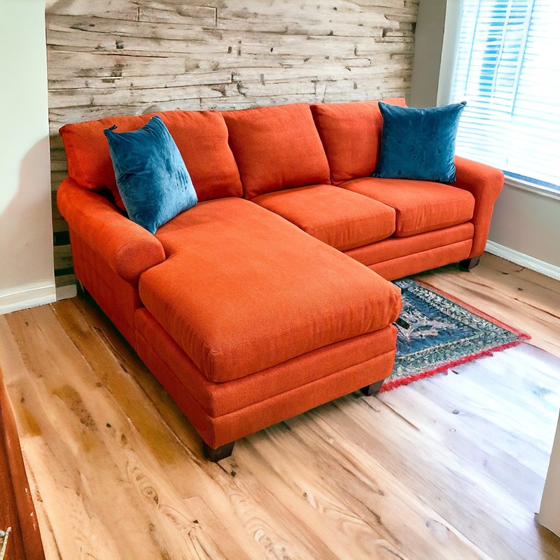 Bassett2 piece sectional couch with leftfacing chaise.A beautiful burnt orange fabric sofa in like new condition and very comfy. All covers unzip for washing, but it has already been professionally deep cleaned and ready for a new home.