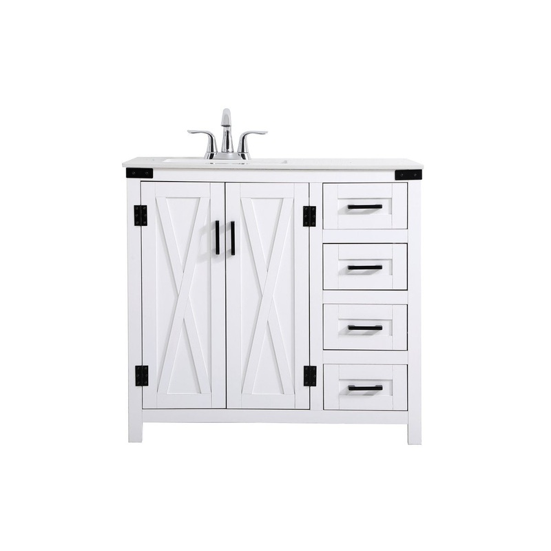 Specifications for this Elegant Lighting Bathroom VanityThe Grant Collection 36 in. vanity is a practical and stylish upgrade for your bathroom. Its white finish is highlighted by the engineered white stone top featuring an under-counter rectangular sink.
