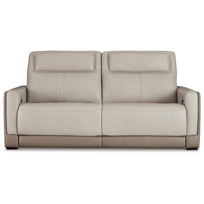 Double down on sleek style with this power reclining sofa. It has a streamlined, space-conscious appeal, with two-tone upholstery in neutral hues creating subtly striking visual intrigue. And with one-touch reclining, adjustable headrests and wireless char