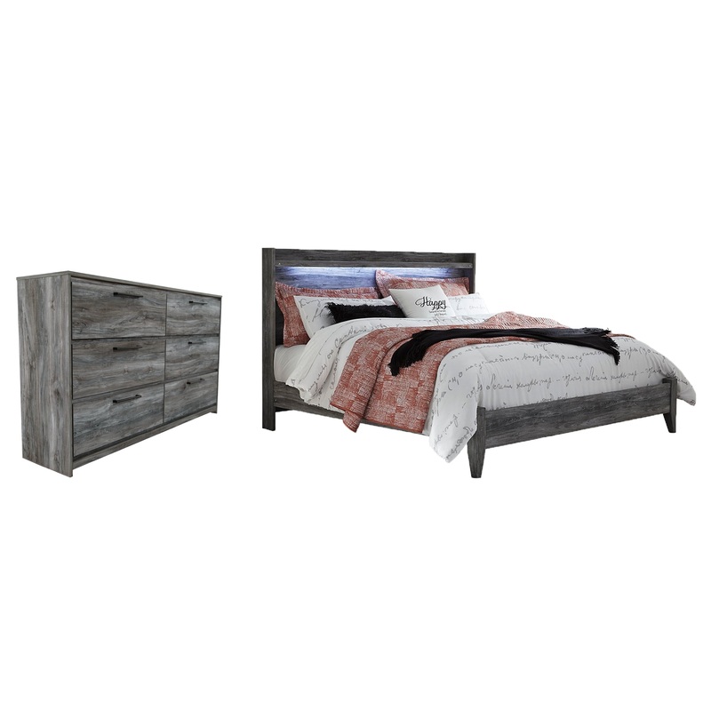 When merged in just the right way, rustic and industrial styles can make one happy marriage. Case in point: this blissful bedroom set. A refined take on barn board beauty, its complex, replicated wood grain showcases hints of burnt orange and teal tones for a sense of weatherworn authenticity. Love to read in bed? Youre sure to find the overhead LED light strip on the headboard such a bright idea. A plethora of storage options await your wardrobe needs.